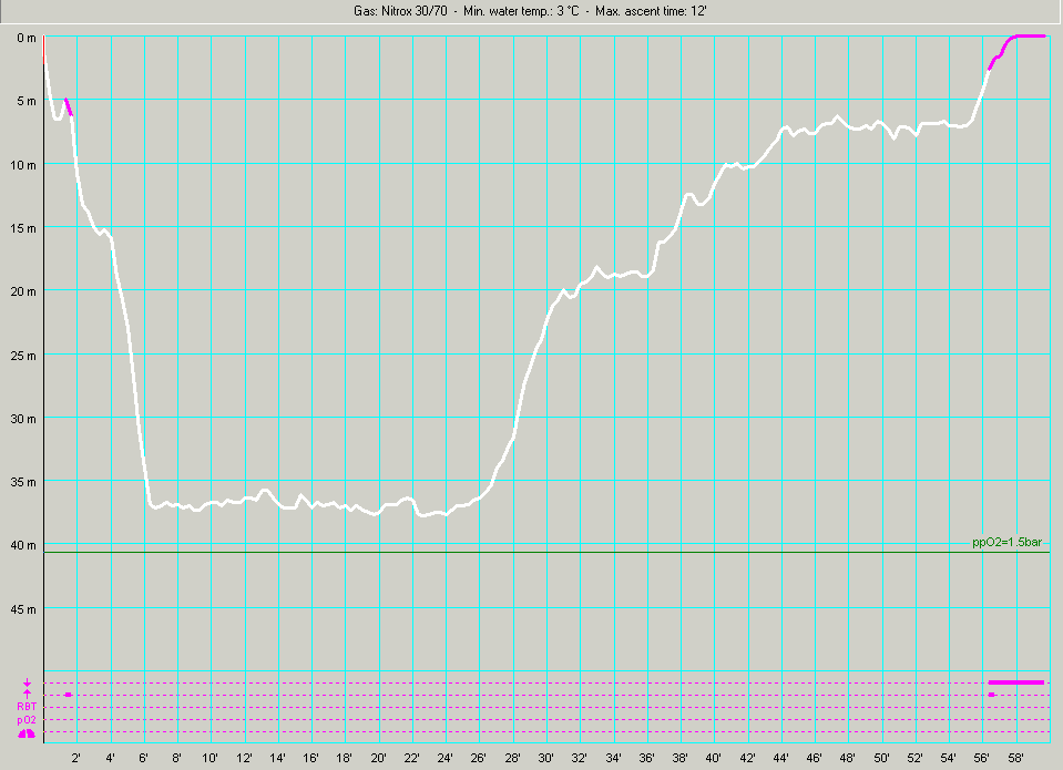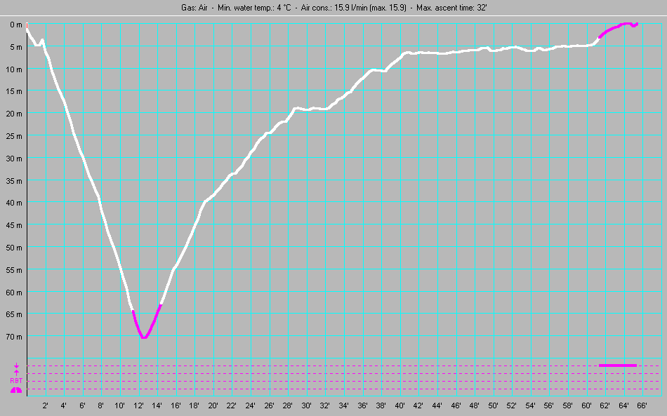 | August 2003 | Trimix dive near the tennis courts of Überlingen together with Hans Drexler . The maximum depth was 70 meters. The dive was made with a 17/45 trimix, a 50% nitrox stage and an oxygen stage. Joachim Teske and Barbara Voigtmann supported us. The dive plan was calculated with the V-Planner. However, the dive plan was modified, in order to make the dive more conservative (in particular, the 6 meter deco stop was extended to 20 minutes). The dive itself was read from an Aladin dive computer. |